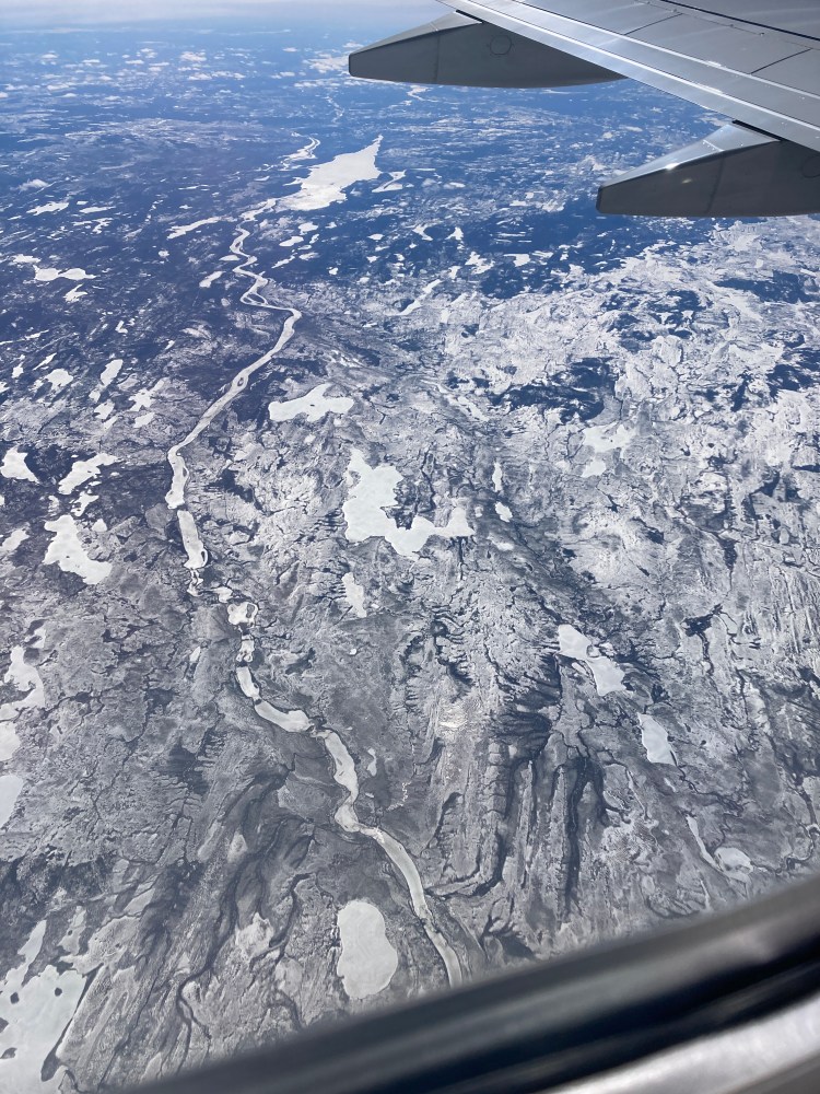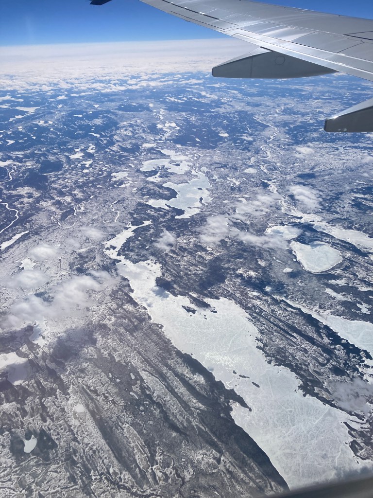 Flying over Canada now, Labrador and Newfoundland to be more precise, and the rivers and lakes, from up here, look frozen; in fact the whole land looks frozen! This tundra is like nothing I’ve ever seen before.