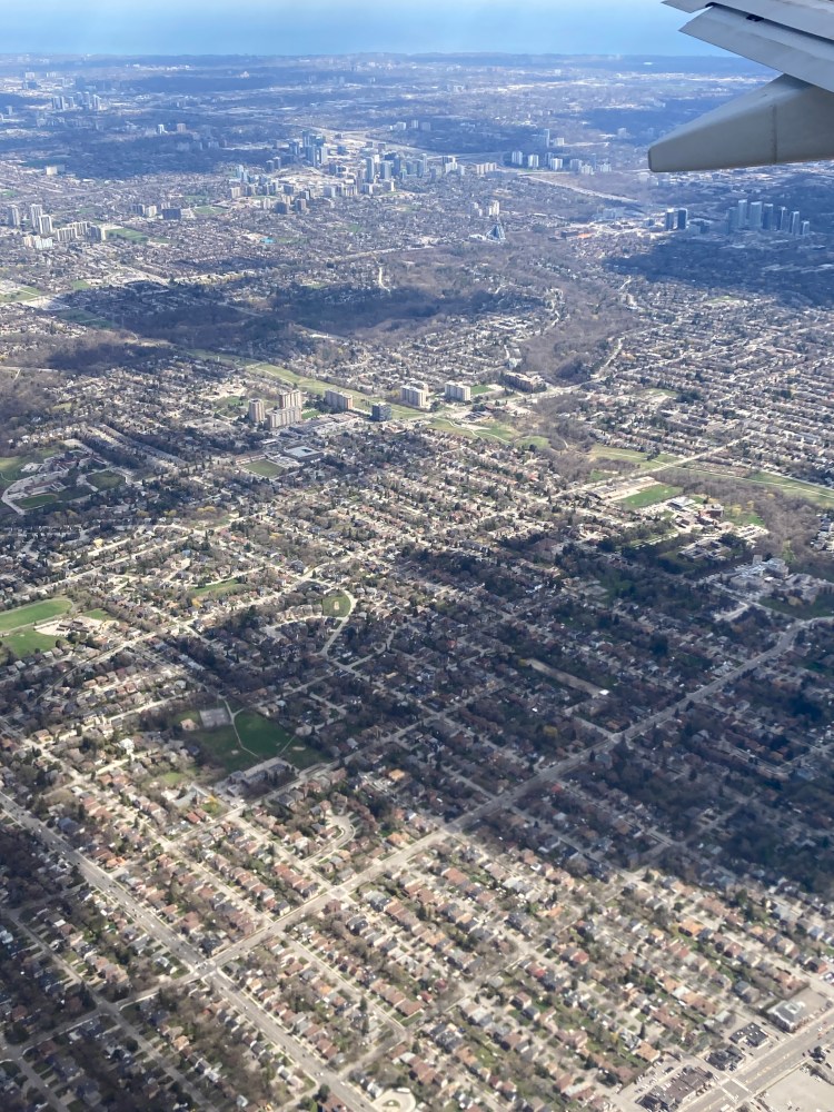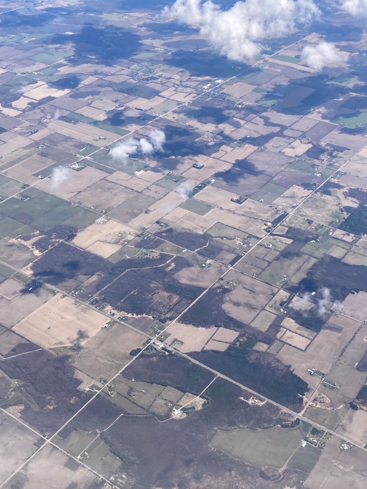 The plane now banks south towards Toronto and clouds cover the landscape in a dense unbroken blanket; I go back to sleep.