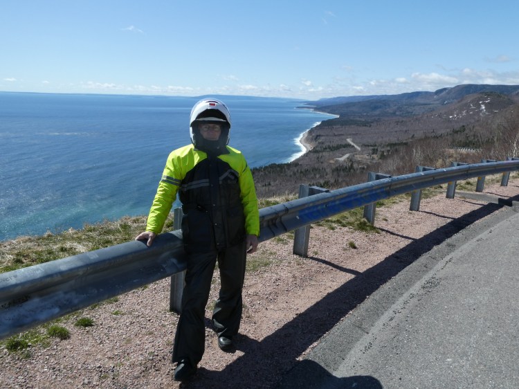 he rain,whilst heavy didn’t last too long, but it brought with it a marked drip in temperature, and by the time I reached Cheticamp, I was in the now familiar half-frozen state. I stopped for fuel and after a slow start had a very pleasant exchange with the guy n the shop. He advised me to be careful leaving the town, because ther was a sharp le hand bend where his own biking career ended many years ago with a bald broken leg.