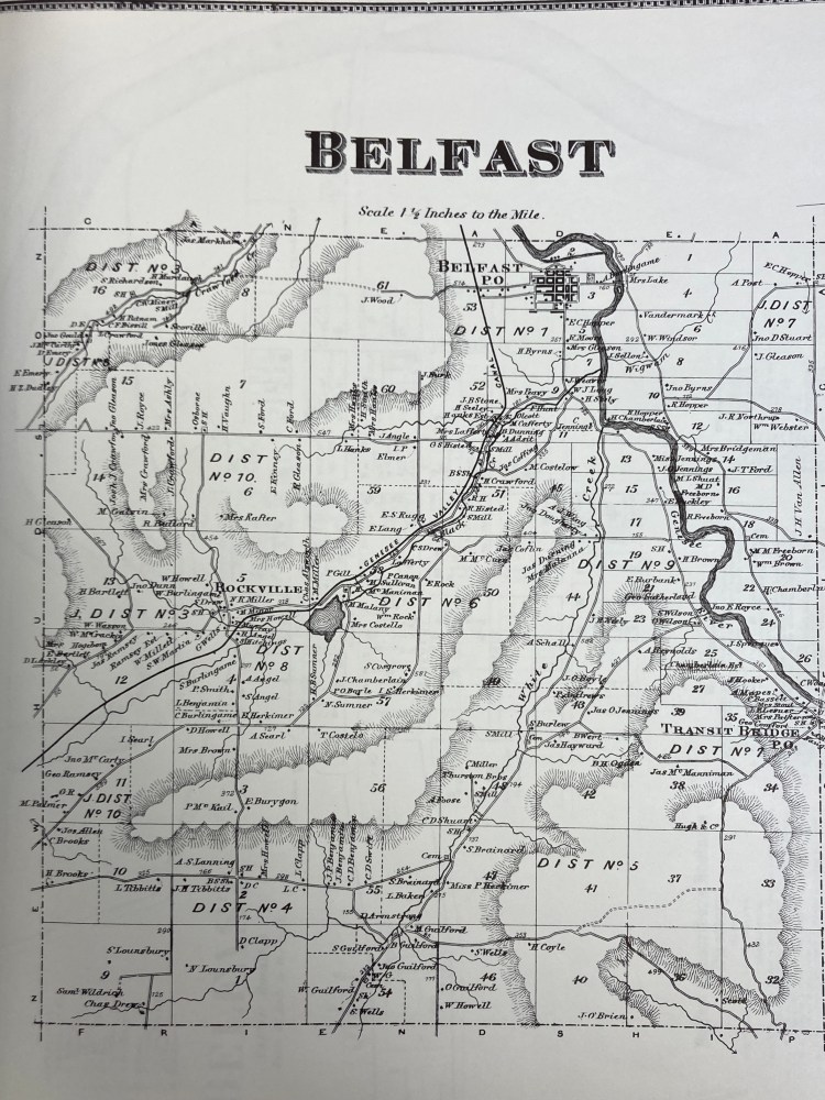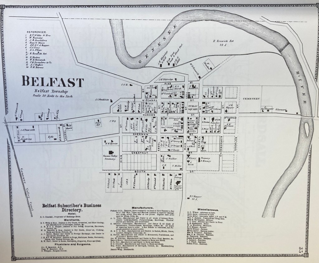 Established in 1824 from part of Caneadea, the town was originally called Orrinsburg. In 1825 the residents changed the name to Belfast; one story being that many of the new settlers were from Northern Ireland, and the other is that the surveyor was from Belfast Maine. In 1831, the size of the town was increased by the state legislature by adding more territory from Caneadea.