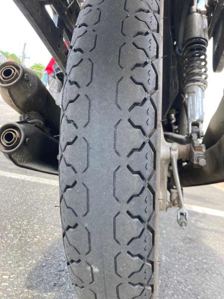 Next morning, Friday, and with a recharged battery the first task is to get the new tyre fitted. Kathy leads me to Pete’s Cycles where they quote me $250 to replace the tyre! Flabbergasted is not quite how I would describe my reaction, but it’s close; I manage to keep my verbal response civil enough to stay out of jail. They will replace the tyre for $75 only (haha) if I take the wheel off, so it’s back to Kathy’s where I wrestle with the job of getting the wheel off without splitting the chain. Putting the centre stand on a block of wood makes the job easier, giving more space underneath, but, as I was to learn next day, makes it more difficult to put it back on. Swings and roundabouts, I guess.