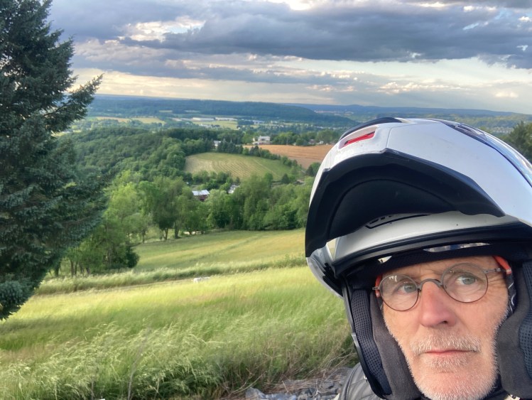 With the new battery installed I set off. It is now gone 7:30, with dusk fast approaching. The bike is running sweetly, and I make good progress. I keep the headlight off as long as possible and all seems well. There is a huge storm visible in the direction I am heading, so I stop to don my wet gear, even thought this means losing the last 15 minutes of daylight. At the filling station I get chatting to an old guy about the direction of storm and its likely duration. He thinks the lightening is “heat lightening” meaning no rain. In any case we decide my best option is to take the highway as it’ll be faster than the cross-country route I had planned, and I might just avoid the rain.