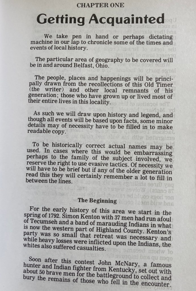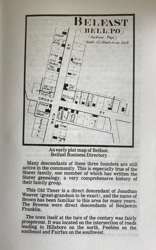 From this, entitled “An Old Timer’s Recollections of Belfast Ohio” written by Ernest W Williamson, I learned that there were settlers in the general area as early as 1792; that the first settler in what is now Jackson County, was one Thomas McCoy; that the town itself was platted (a North American verb meaning to plan out or make a map of) on the 19th March 1834; and that the owners at that time were James Storer, Jonathon Weaver and Lancelot Brown. Perhaps the McCoy was the one to christen the town; who knows now?