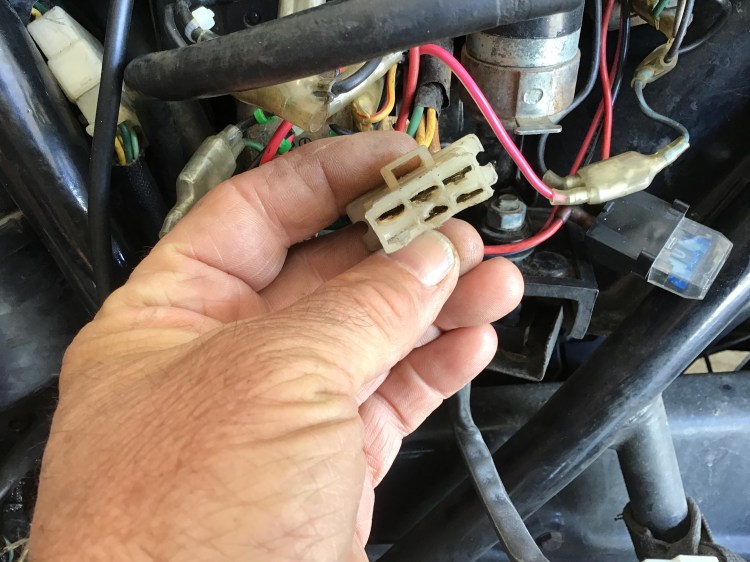 Everything in and on the charging system was checked, and almost everything checked out. The one thing I did find was a melter connector block suggesting overheating. This it was suggested could be due to a bad earth connection, and if this involved the starter, could result in a large current to the rectifier, damaging it. Based on this, the fact that the battery seemed to be holding up, and with a plan to avoid using the starter, I decided that I would head black “home” to Greencastle.