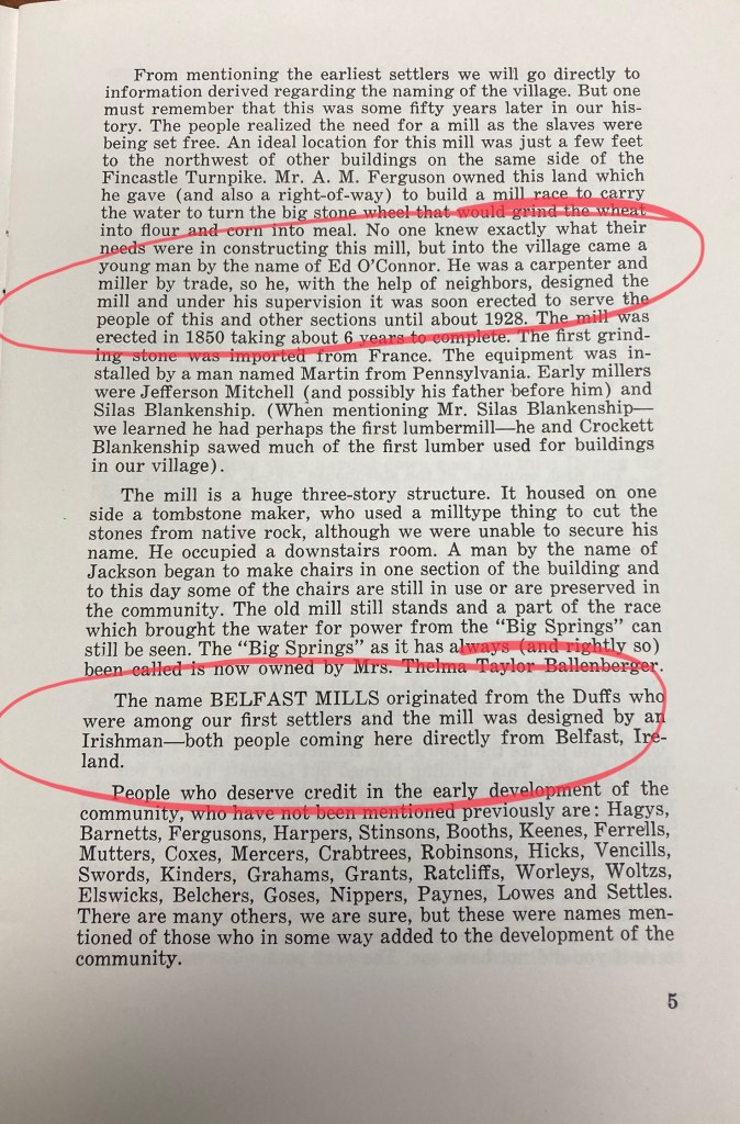 As far as the name is concerned, the area was named Belfast by one Sammy Duff, from Belfast, Northern Ireland. Duff bought land from one of the earliest settlers, Daniel Smith and when a name was sought for the newly established Post Office, Duff named it Belfast Mills, and the surrounding area subsequently became known as Belfast. Coincidentally, the mill was designed and its construction supervised by another Belfast man, Ed O’Connor.