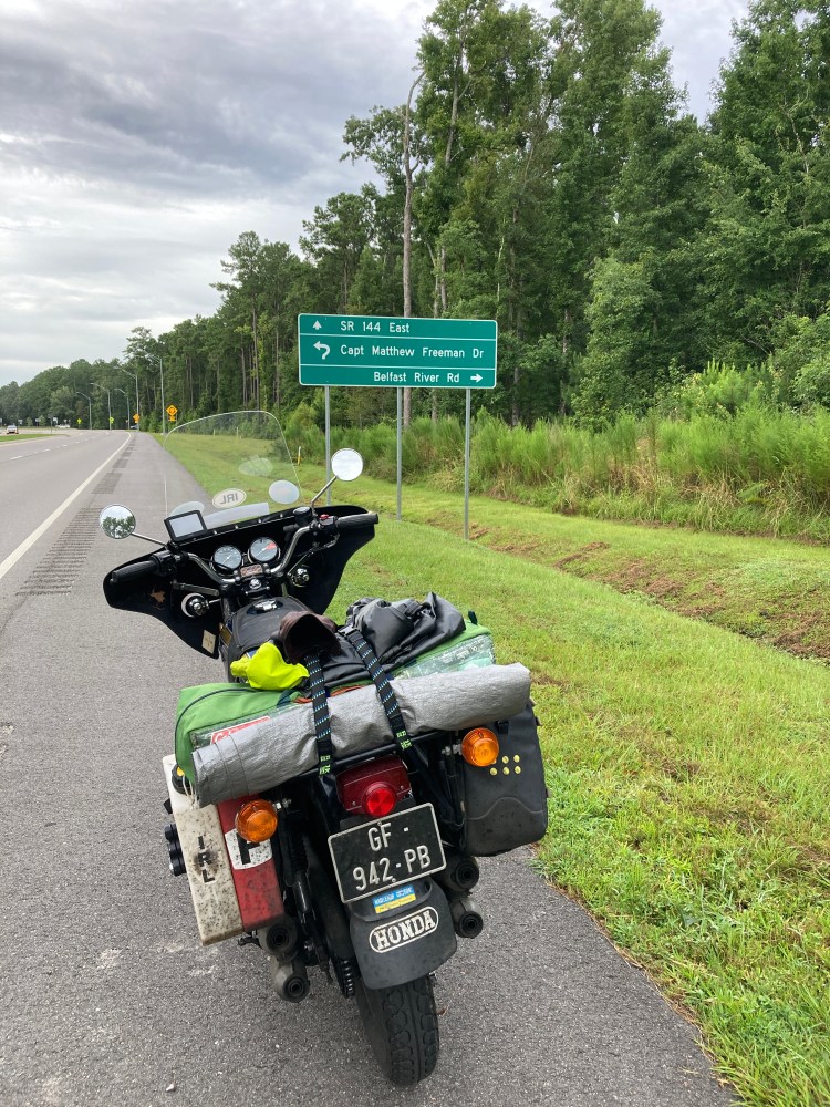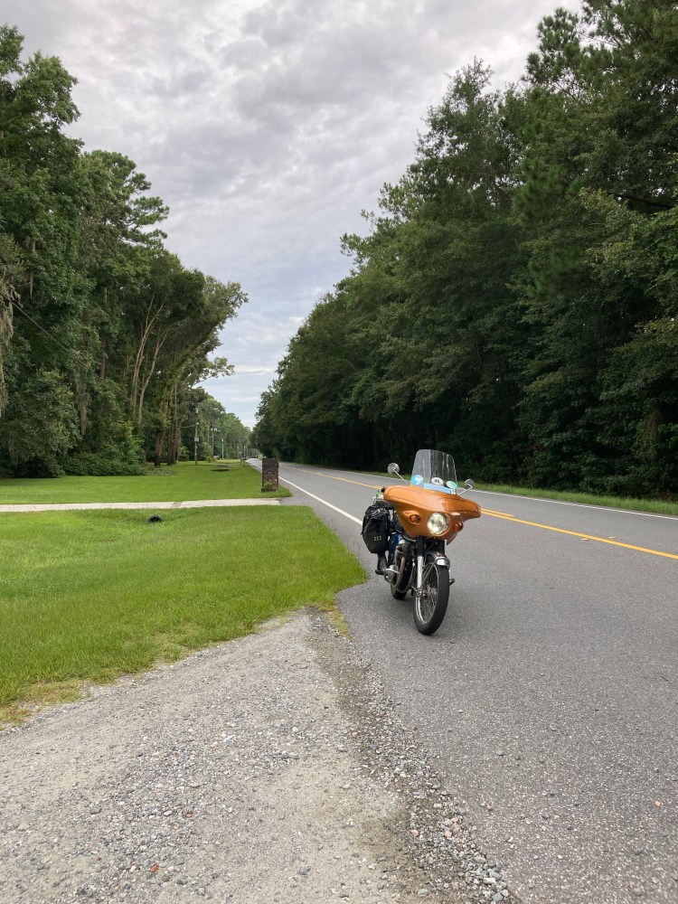 I was heading for Charleston and had decided to ride down the coast, through Myrtle Beach; big mistake! Myrtle Beach is a 50km long strip mall. My abiding memories will be heavy traffic, heavy rain, and hundreds of f***ing traffic lights – every 100 metres! The going was slow and hot but I eventually found my way to the coast. When I think of a coast road, I think of a road that literally follows the coast and from which you can see the waves hitting the beach. Not so here; the “coast” road is a major road from which you might catch a glimpse of the sea if you happen to be looking in the right direction at the right time.