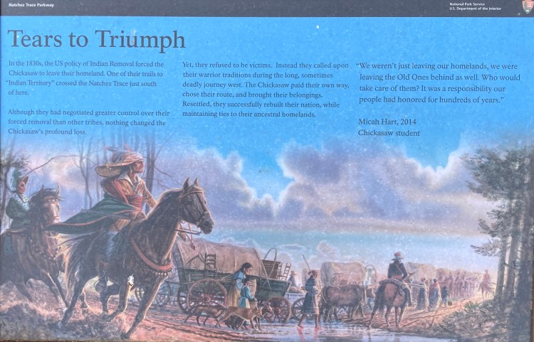It was a longish ride today, so I ploughed on until the heat and humidity forced a stop. I pulled into a “historical site” and saw a tableau commemorating the forced removal of the Chickasaw Indian Tribe from their ancestral homelands. I found this a poignant reminder of the shameful history of this so-called “Land of the Free”; a history which I don’t think the majority of white Americans have acknowledged and this possibly contributes to some of the country’s ongoing difficulties.