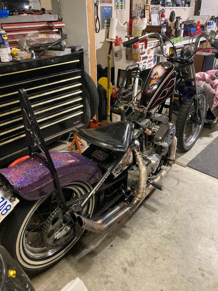 The work on the bike involved a routine service, cleaning and readjusting the carburettors, replacing the leaking fuel tap; and trying to stop the oil leak from behind the points cover. The last involved replacing a small o-ring, not a difficult job in itself; however, the o-ring is not a common size and all efforts to find one locally were in vain. The matter was not helped by Canada’s amazingly slow postal system. The day was saved by Karen’s friend James, who searched through his o-ring collection and lent me a kit to make o-rings. I used the latter to fabricate an o-ring, and to date my left leg stays dry. Thank-you James. James also has a collection of bikes, the most interesting of which is his rat-bike.
