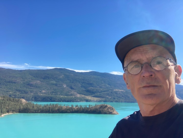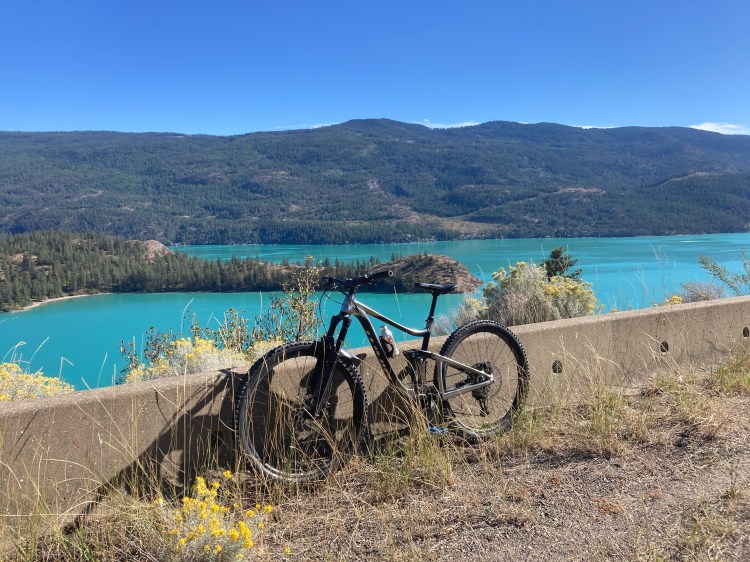 Almost, yes! I left Coldstream yesterday with the sun rising over my left shoulder; the clear blue sky bisected by a pencil-thin jet stream; the milky-blue (can’t think of how else to describe the colour, but it was more blue than white) lake waters glittering in the morning sun; and all contrasting with the dark green of the pines covering the hillsides. It was a perfect day for riding, and made all the better as the bike was purring along like a well-oiled sewing machine. It was not to last!