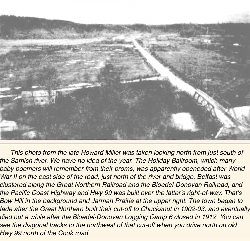In common with several other Belfasts, this one developed around a railway junction. William Gilmore, Sr., pioneer merchant of Edison, was the father of Belfast according to one of his early day friends, B.F. Smith. He supplied the Belfast area in the earlier days and expecting a large town to sprout up with the coming of the railroad financed several businesses there. And since he was a native of Belfast, Ireland, he named the place for his hometown. (Source: Skagit River Journal)