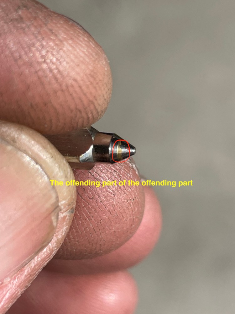 It looks like you got some really ‘wet’ gas along the way, rusting the chrome plating right off that float valve! I usually only see those after the carbs have been sitting unused for years with old, wet gas in them. Glad you found the culprit: that would explain both the overflows that blacken the sparkplug from too-deep bowls and the total lack of gas at other times, when a flake of it would make it stick closed! I can see both happening.