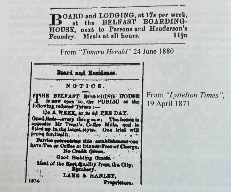However No 1: The name “Belfast” was in use well before the establishment of the meat factory. Two newspaper advertisements offer accommodation at the Belfast Boarding House, one in Timaru, about 160 kms south of Christchurch, and the other, earlier one in Christchurch itself. The latter is dated 19 April 1871.
