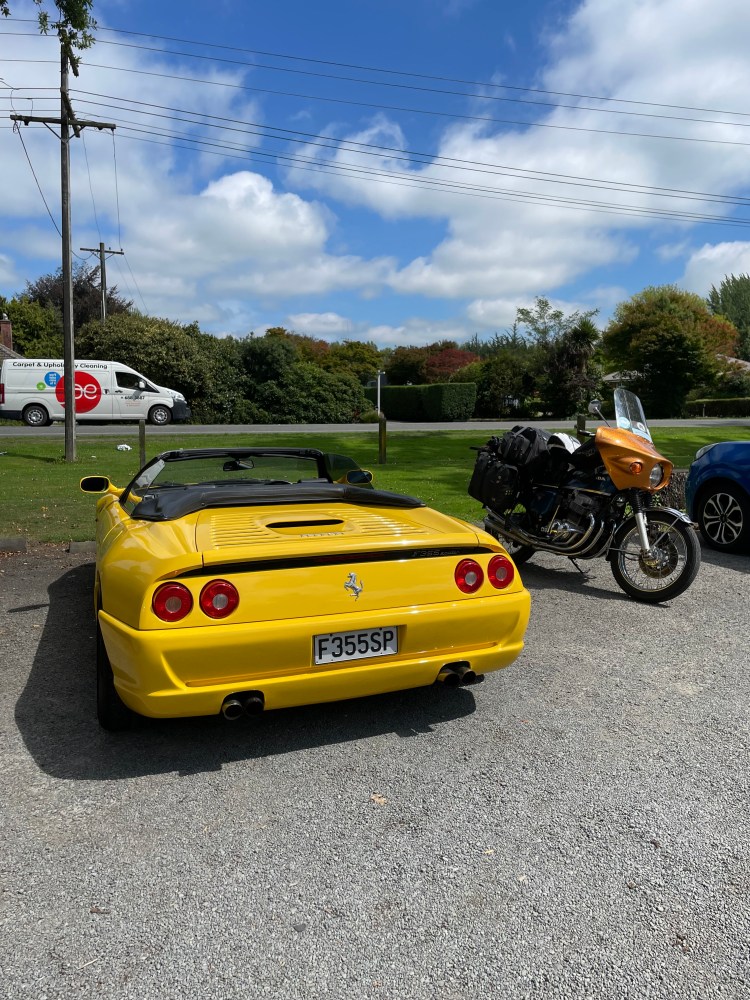 The area around Christchurch is flat, and I don’t mean just flat; it is flat, flat!! (See the photo above) That is boring enough, but the roads I started on joined in the chorus. It was straight; not the slightest deviation for nearly 35 kilometres. I kept going for 185 of the 250 kms just to get it over with and stopped for coffee in a little place called Geraldine, where I had the best chocolate éclair I’ve have in a looong time. Some guy parked an old banger next to me, and obviously thought this enhanced the appeal of his car, because he followed e to the petrol station.
