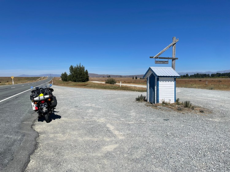 I stopped at a scenic viewpoint by the shores of Lake Pukaki, and it was here that I first thought that much of NZ had been transformed into one giant tourist park. Every building/location linked to something more than 50 years old is now a historic site indicated by a brown road sign directing the multitude of tourists to the best selfie spot and the ubiquitous picnic tables. Everything even slightly unusual is worth going to see, according to this approach; included in this list of “must-sees” is a field full of boulders, (Elephant Rocks) and a beach littered with rocks! (Moeraki Boulders) Great for taking photos or entertaining the kids, according to the blurb in “Lonely Planet”; nothing lonely about these places though! Just about the only things not touted as attractions are the stock effluent disposal sites intermittently sited along the road.