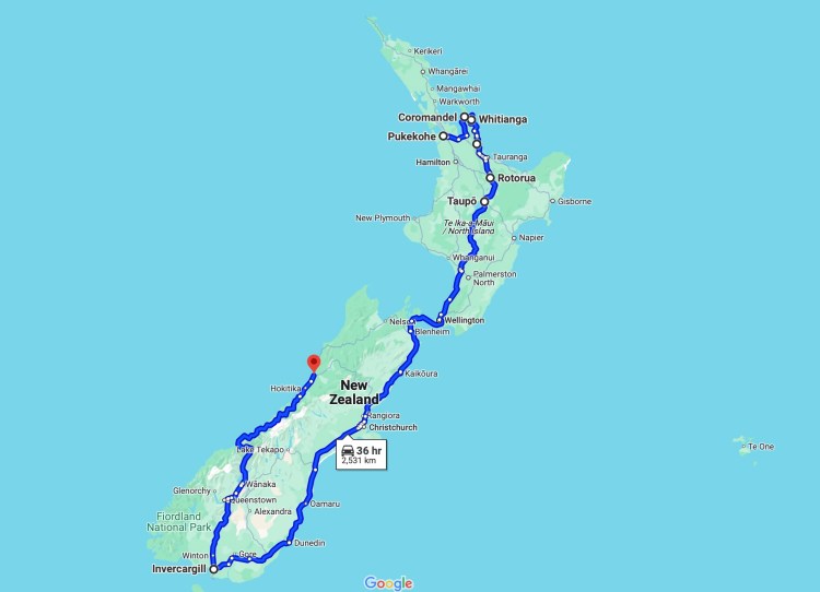 It is also more than three months since I arrived in New Zealand, for a stay that was planned to last 3-4 weeks. The intended route is shown in the photo above, and the actual route below. As I learned on my first trip, no plan lasts for long.