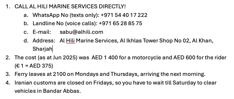 We then found a contact for the actual shipping company, and a very helpful chap, provided all the information necessary. I can leave on Thursday night, if I’m ready, but he didn’t recommend that as on Friday – it’s an overnight ferry – Iranian customs are closed. I’d have to spend the day/night at / near the port and complete customs clearance on Saturday morning. “Better to wait until Monday”, he opined. This may prove to be good advice, but today’s ferry was cancelled due to bad weather, so …