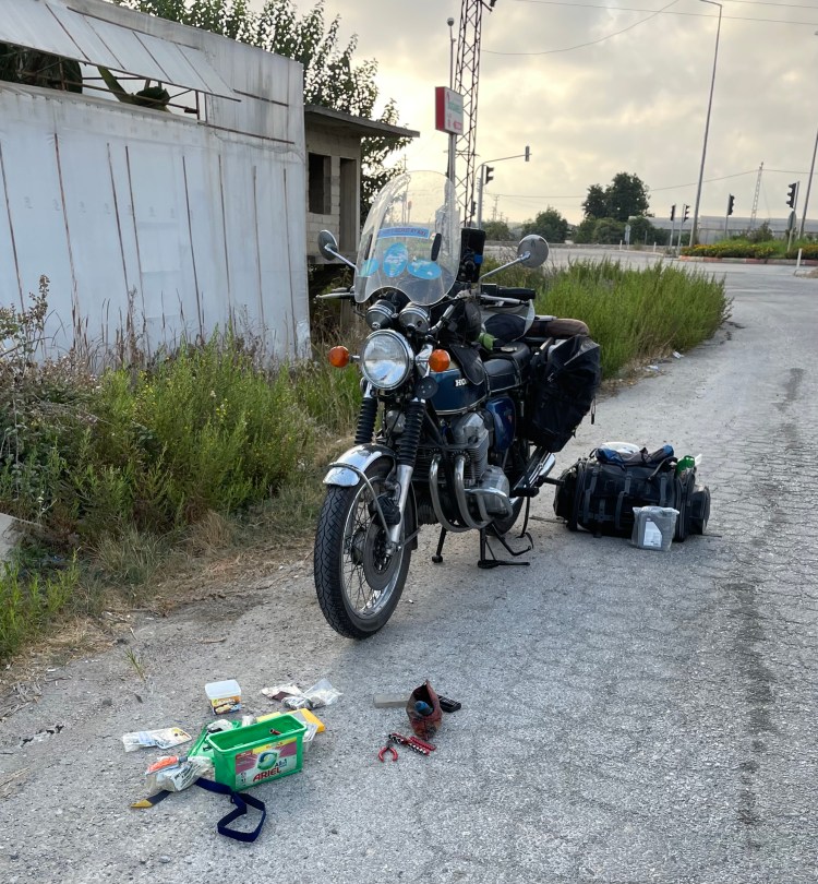 Anyway, luckily, the spring was still in place and I had a bolt of just the right size. All was put back as it should be, and 50 minutes after stopping, I was back on the road.