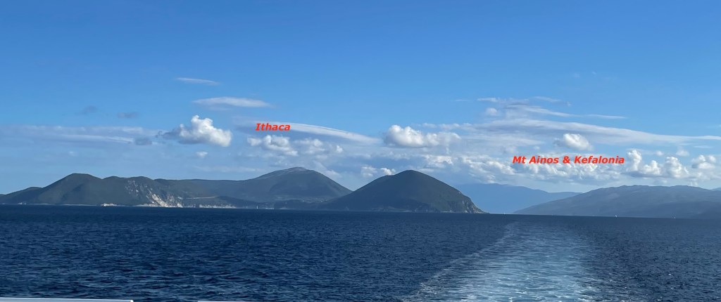 Like many things in life, it depends on your point of view. Katakolo lies to the south-east of the islands in question; my photo, taken on leaving Kefalonia, heading slightly east of north, shown Ithaca’s mountains to be more visible, though Mt Ainos looms in the background.